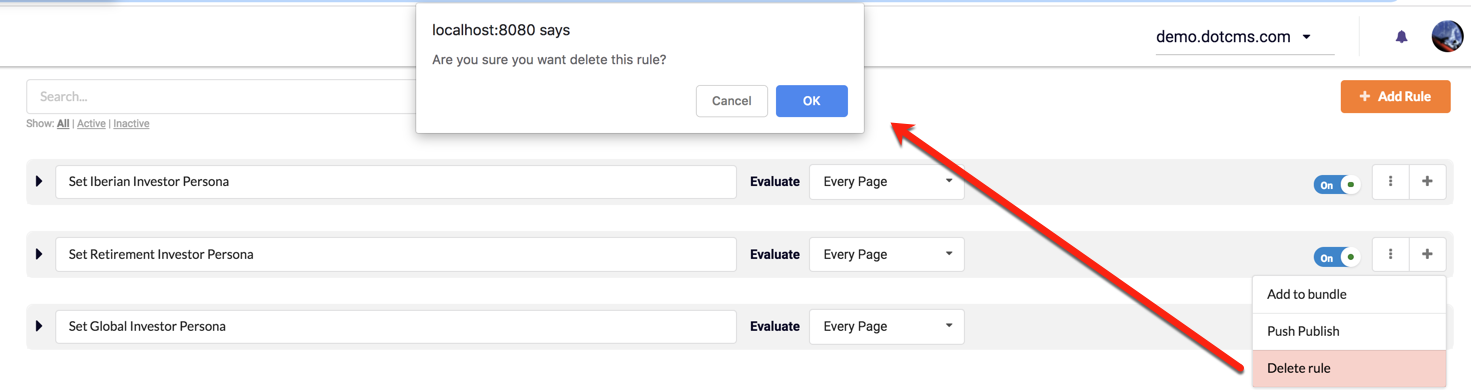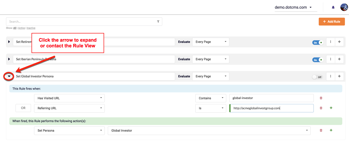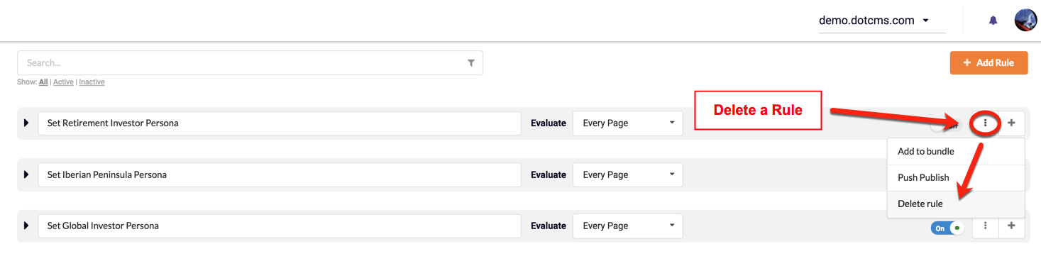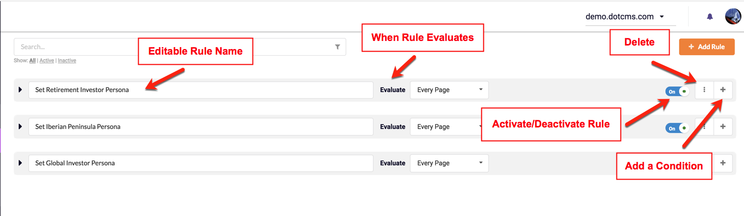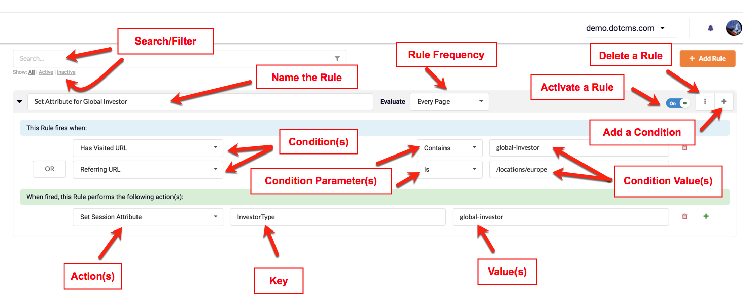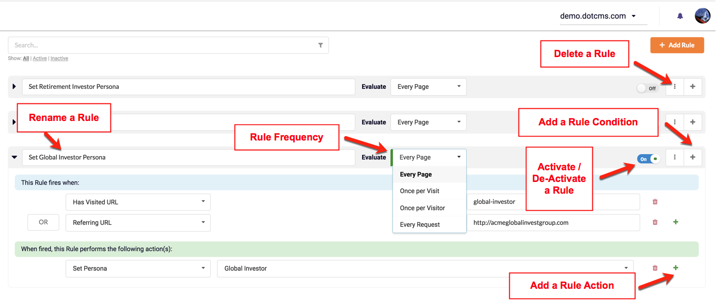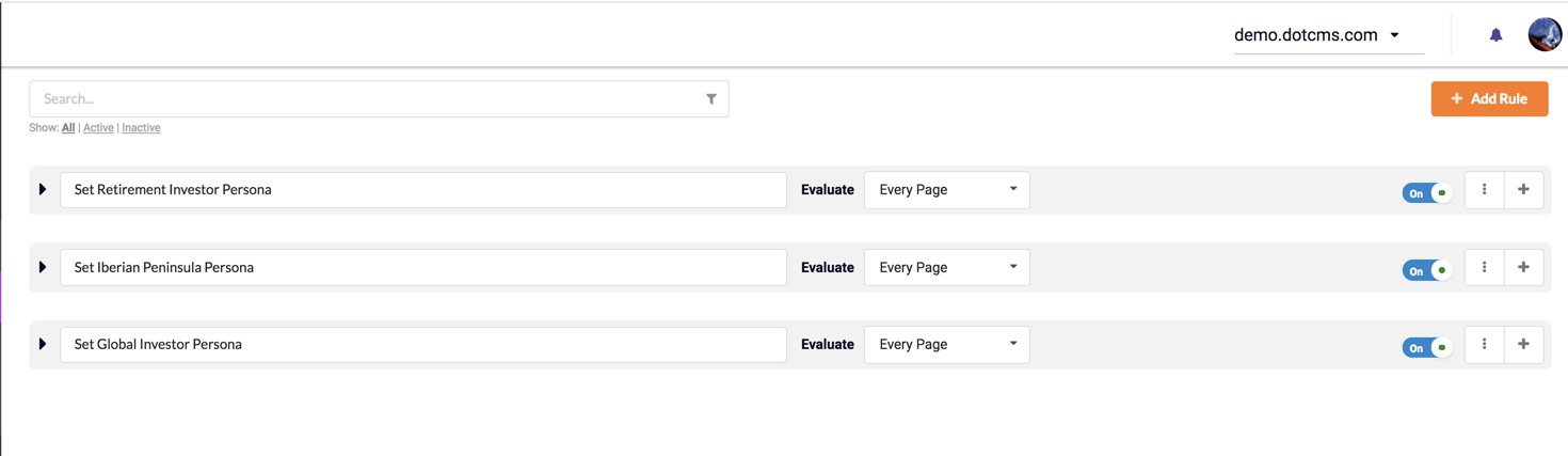 If a Rule is activate (On), dotCMS will evaluate each Condition and apply Actions if the Condition(s) evaluation results are TRUE. Rules can be de-activated (OFF), to suspend Rule-set Actions. Rules can be activated/de-activated using the On/Off button.