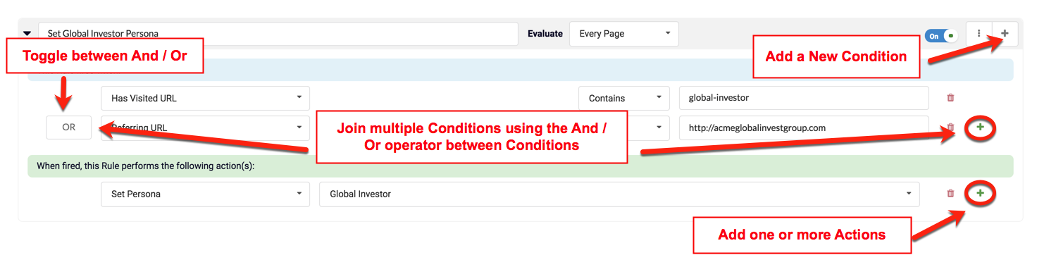 To add a new Condition to a Rule, click on the + at the right of the grey Rule bar. To add complementing Conditions or a "Condition Group", click the + to the right of a Condition, and then set the AND/OR property to the left of the new Condition. To add a Rule Action, choose an appropriate action from the select box to the left of the Green Actions section at the bottom of a Rule. Additional Actions can be added by clicking on the green + to the right of the last Action listed.
