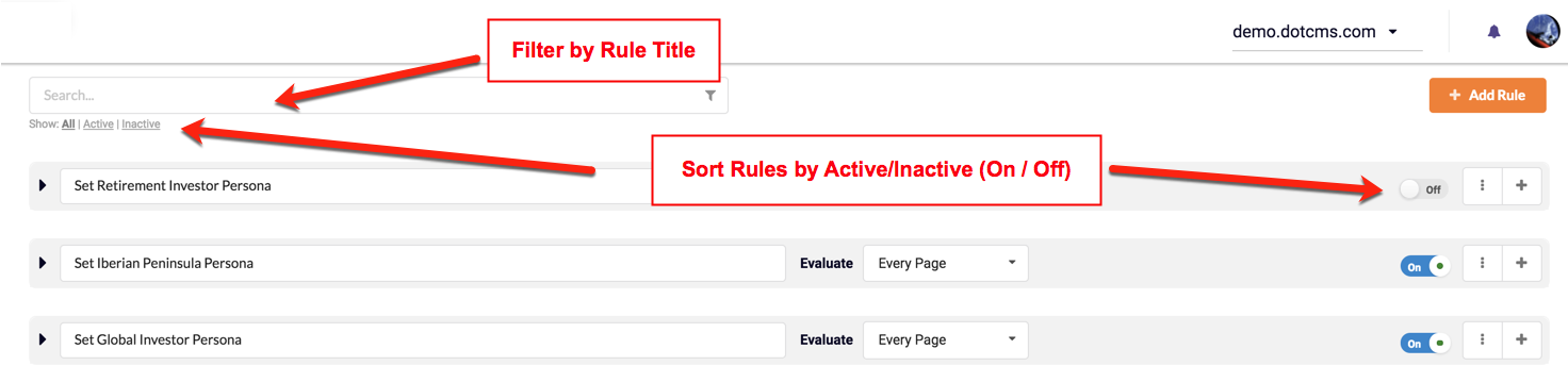 Rules can also be filtered to show only Active Rules, only Inactive Rules, or All Rules (default) by clicking the appropriate filter in the Show filters under the Search box at the top of the Rules list.