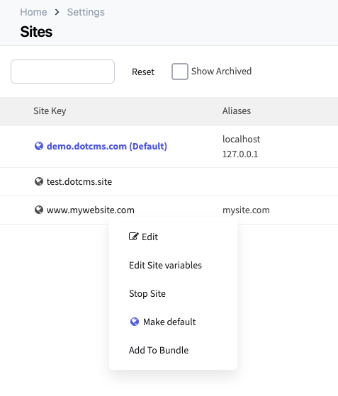 Note: The default site cannot be archived. To archive a site, first assign a different site as the default.