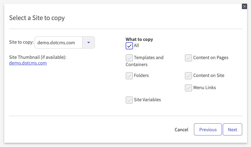 Select Copy an existing site and click Next. Choose the source site from the dropdown, then use the checkboxes to select which object types to copy (templates, containers, pages, etc.). Click Next to open the site properties editor, pre-filled with the copied site's properties — edit as needed before saving.