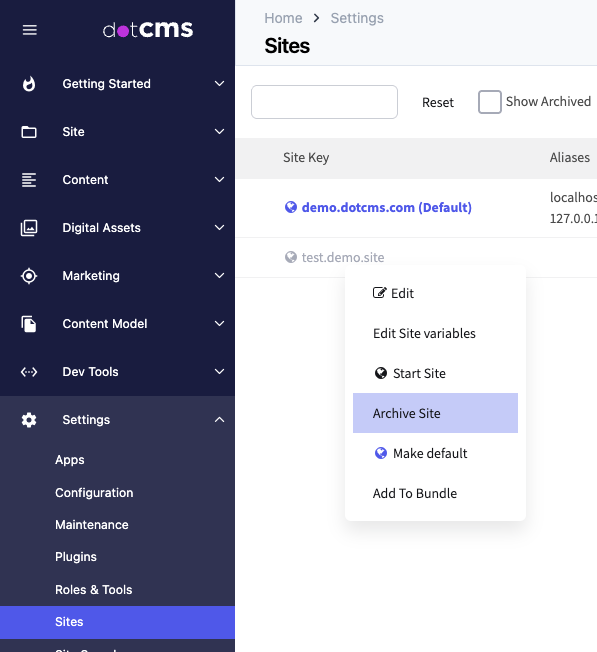 Sites in dotCMS follow a defined lifecycle: Active → Stopped → Archived → Deleted. Each transition requires the previous step to be completed first.