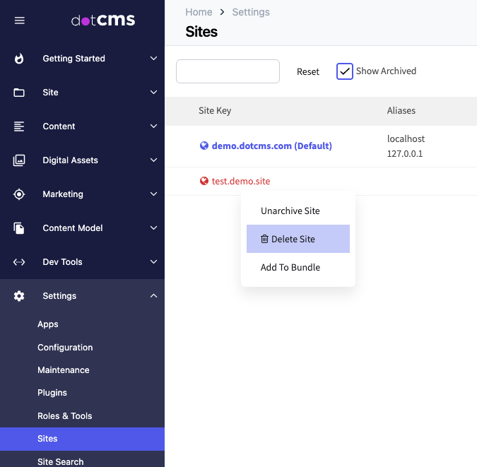 | Delete Site | Permanently delete the site and all its contents — this cannot be undone | Archived |