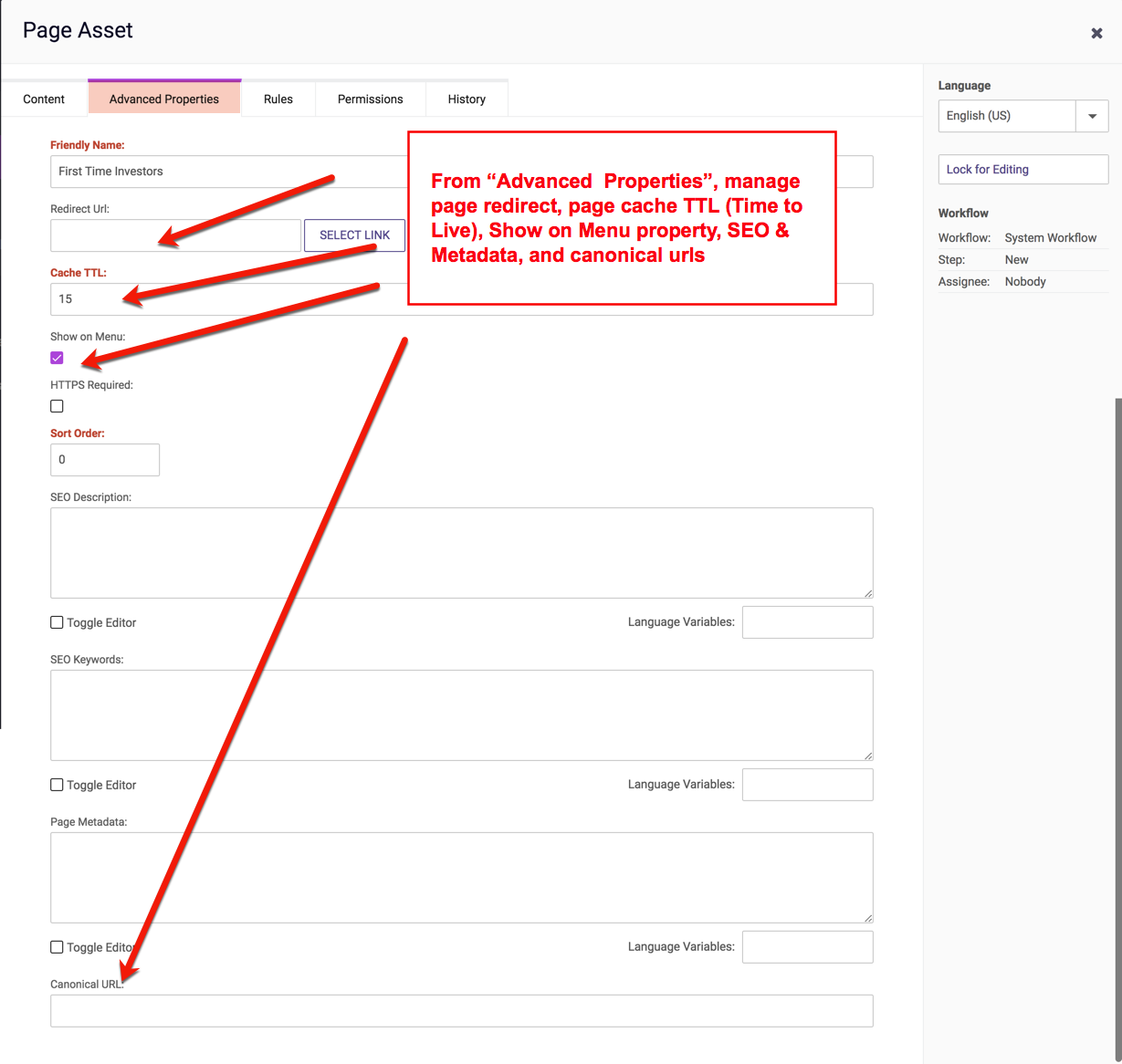 The image below displays all of the Advanced Properties available on a default Page Asset.