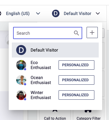 The Visitor Menu lets you display personalized versions of Page content, using visitor Personas. Selecting a Visitor Persona sets the Persona on the page, triggers Rules, and re-renders the page to display the appropriate personalized content (if any exists).