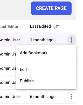 You may also remove or edit a bookmark from within the bookmarks pane at the top of the Pages Tool; just click the same hamburger on an item within the pane. In addition to editing or removing the bookmark, you can edit the Page or contentlet itself, or perform Workflow Actions on them. (Note that some workflow actions may require a contentlet to be in the correct workflow state to receive it.)