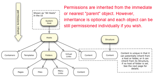 Inheritance is optional. Each object can be still permissioned individually if you wish. But, if permission inheritance is set up correctly, it is possible to make child content/objects either editable or hidden to content contributors based on the Role permissions given to the parent objects. Webmasters can set up parent objects so that they pass on their permissions to child objects so that the webmaster does not need to worry about permissioning each child object individually.