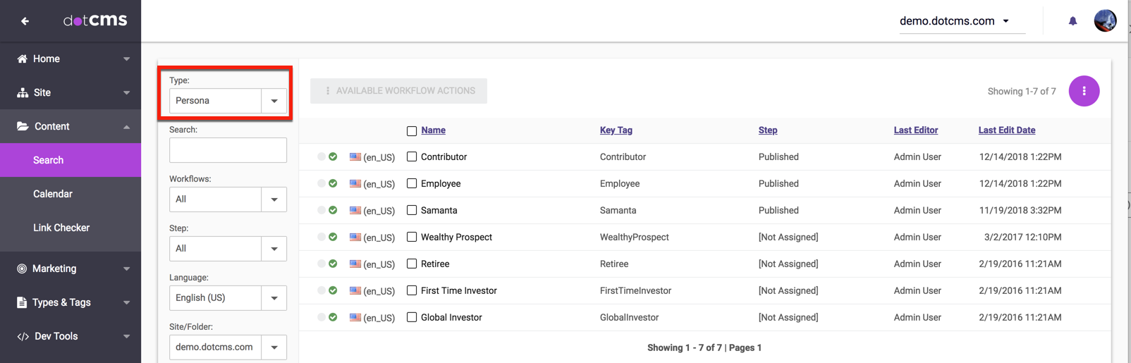Personas are implemented in dotCMS as content. Personas may be created, modified, copied, displayed and searched for in the Content tab.
