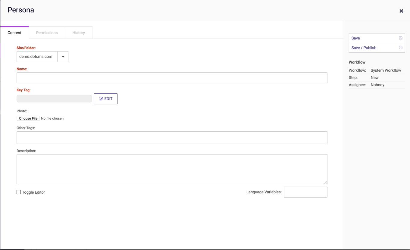 Note: Personas are intended for use by backend users only, and as such do not support multi-lingual versions. You may only create Personas in the default language for your dotCMS site.