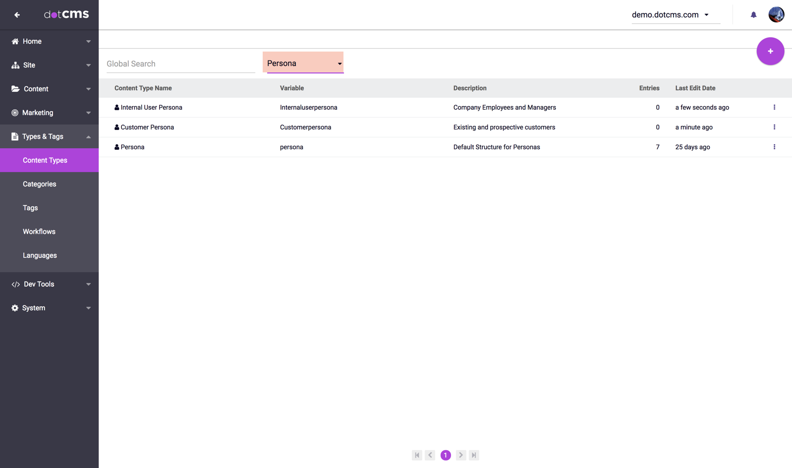 Since Personas are Content, the Persona Content Type can also be used to extend Personas. You may create multiple Persona Content Types, and you may add fields of your choice to each Persona Content Type to support any additional information you wish to be associated with different types of Personas. To view, add and edit Persona Content Types, select Persona from the list of Base Content Types in the Content Types tab.