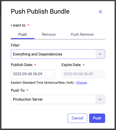 | Push to | A list of the Publishing Environments the content will be pushed to. |