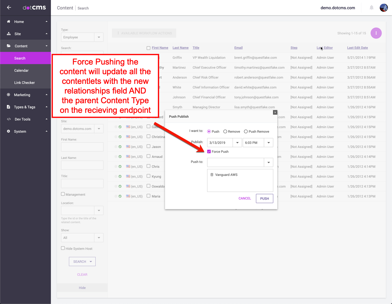 - Go to the Content Search manager and select all of the content for one of the related content types that has the new relationship field(s), and select PUSH PUBLISH, and make sure that you select the FORCE PUSH, so that each contentlet will be updated on the receiving server regardless of whether there have been any modifications to it or not since the last push.