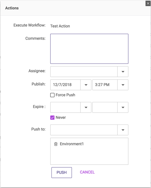 The Push Publish Sub-Action push publishes content, allowing the user who executes the Workflow Action to choose how to perform the operation. This Sub-Action opens a popup with selection for all the normal Push Publish options, selecting the Environment(s) to push to; which push publishing filters to use; or whether to push, remove, or push remove (i.e., both pushing and removing, within publishing and expiration date ranges).
