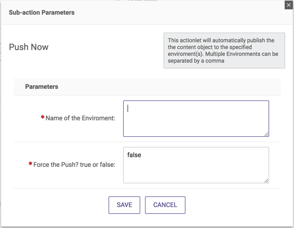 The Push Now Sub-Action configures the Workflow action to perform a Push Publish to specific Publishing Environments and with a specified value for the Force Push option.