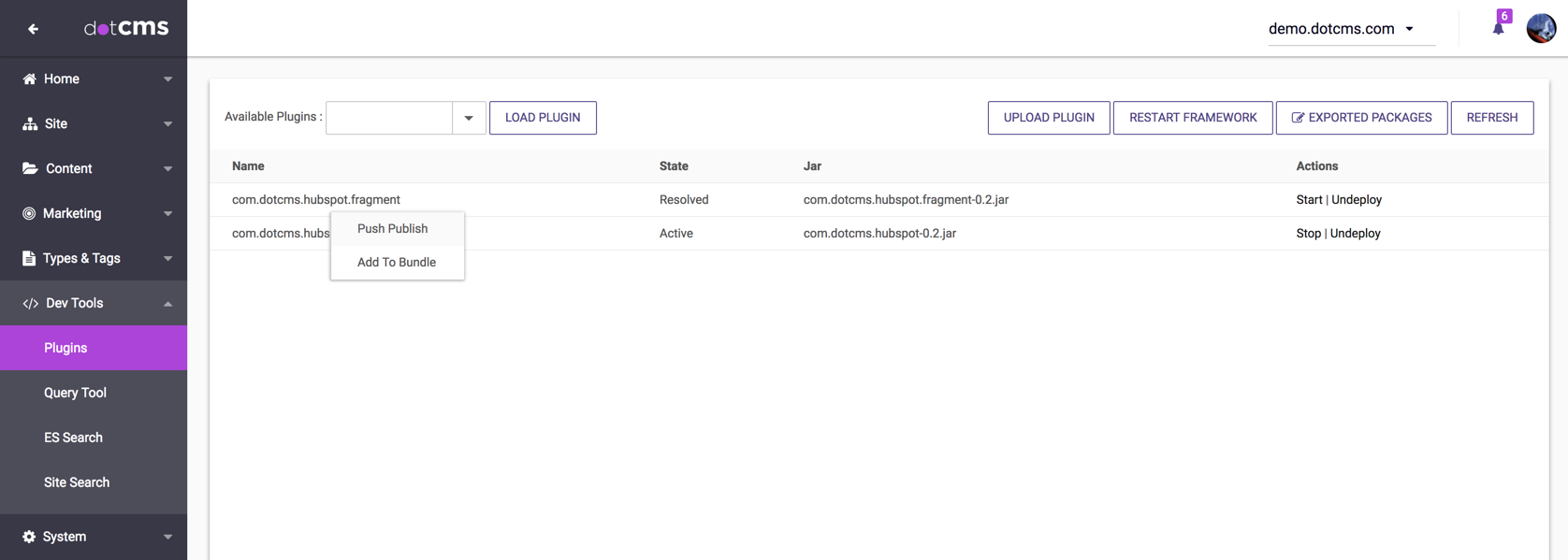 - Select either Push Publish to push the plugin individually, or Add to Bundle to add the plugin to a bundle for later publishing.