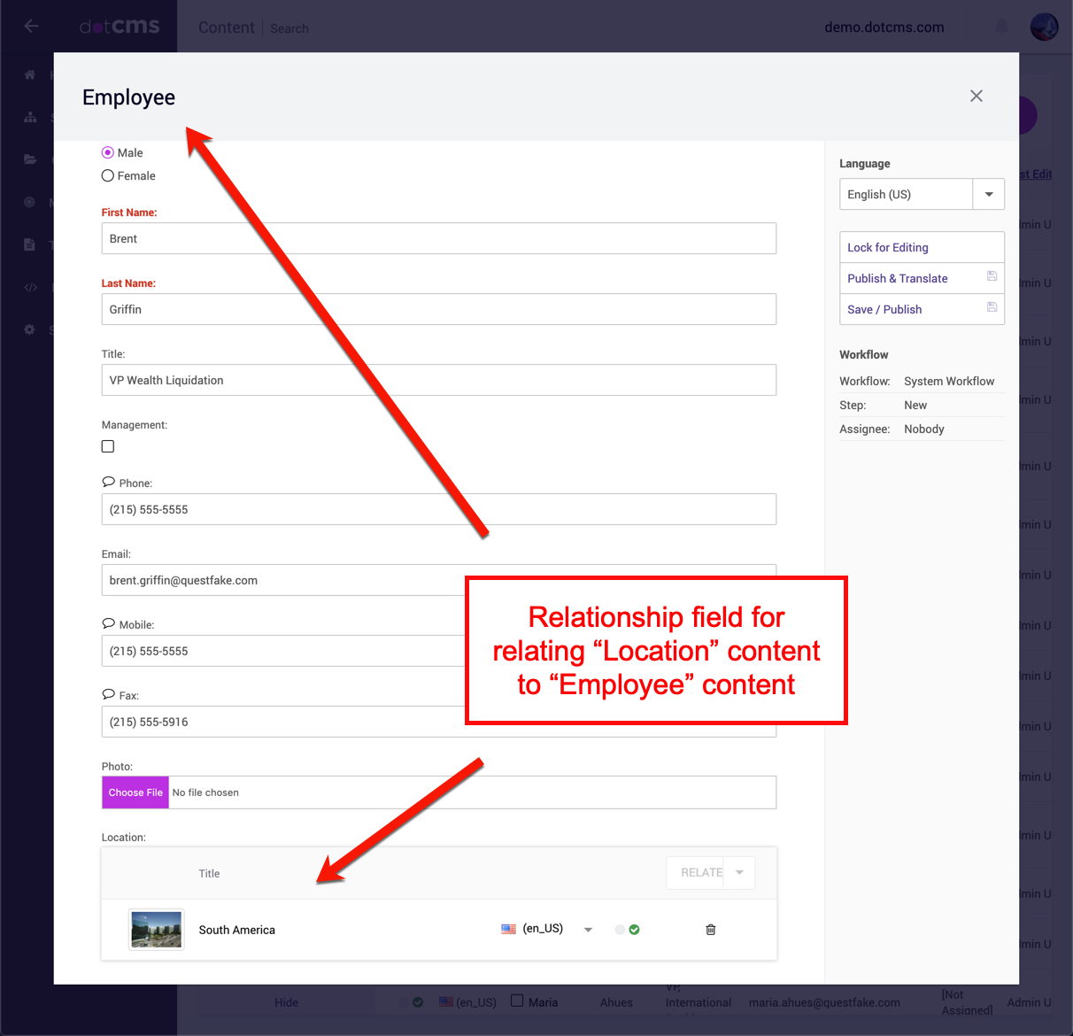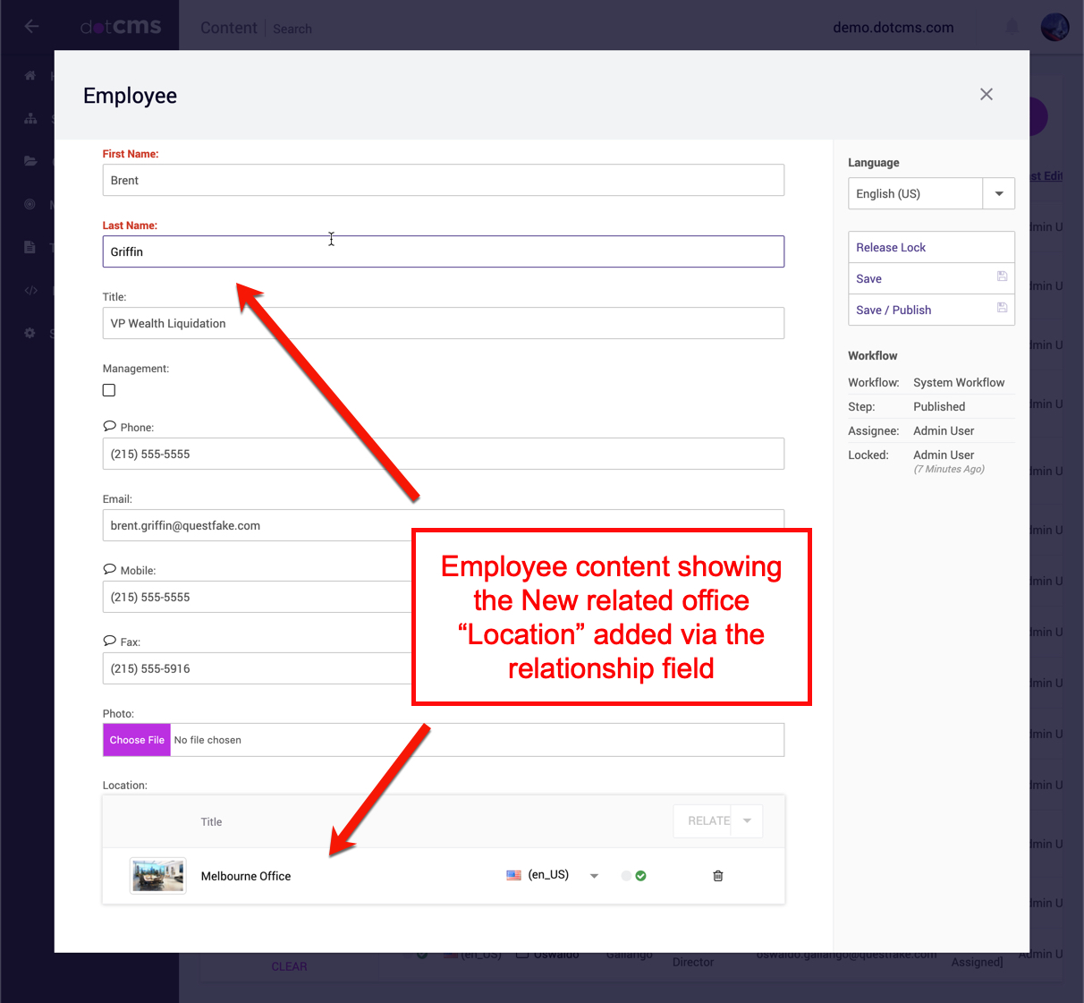 After Saving or Publishing the new content that should be related to the prior content, in this case a new Office Location will be added to the system and related to an employee named Brent, then click the Return to:{content name} button to verify that the new content has been both added and related to the original content.