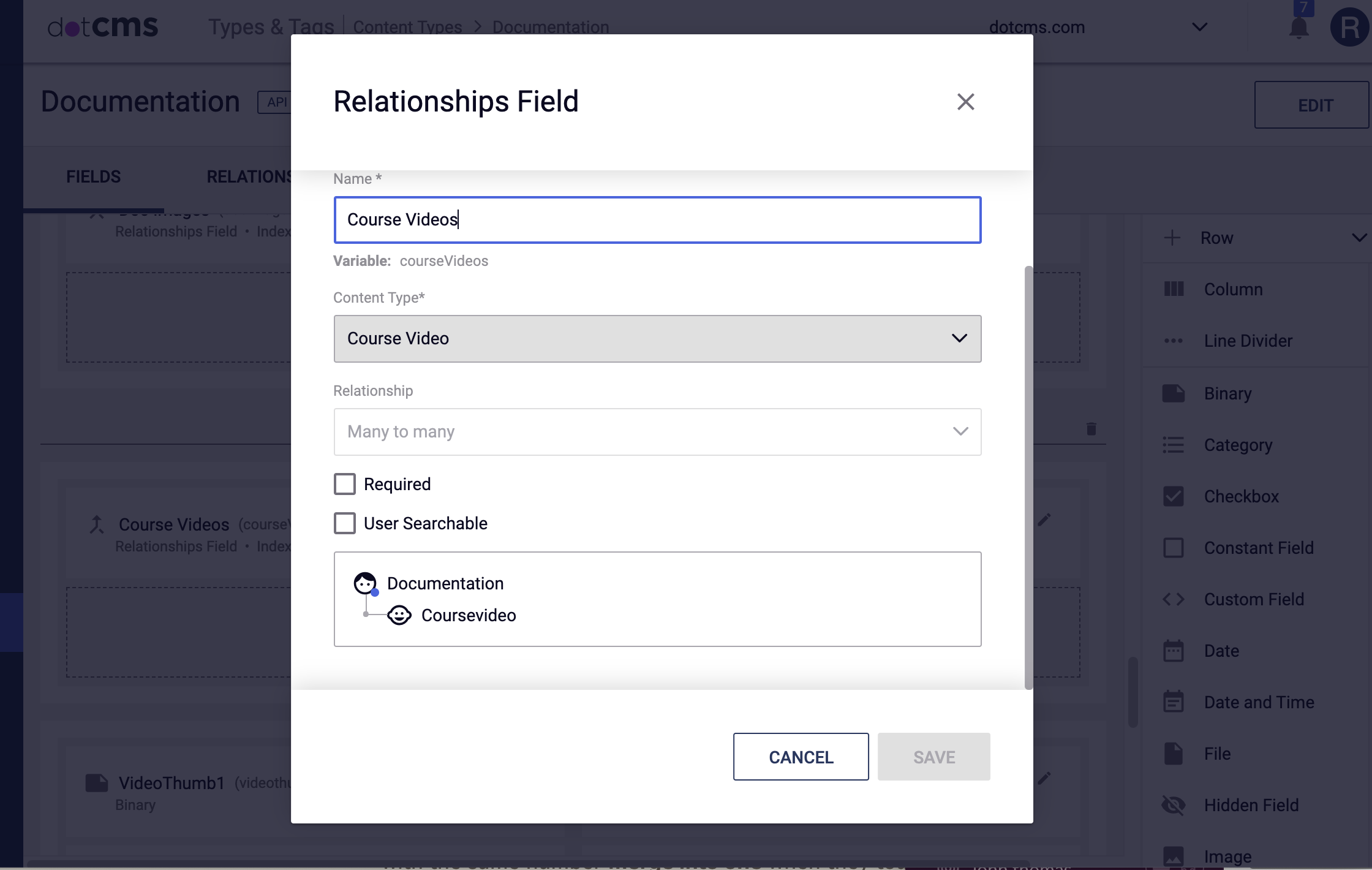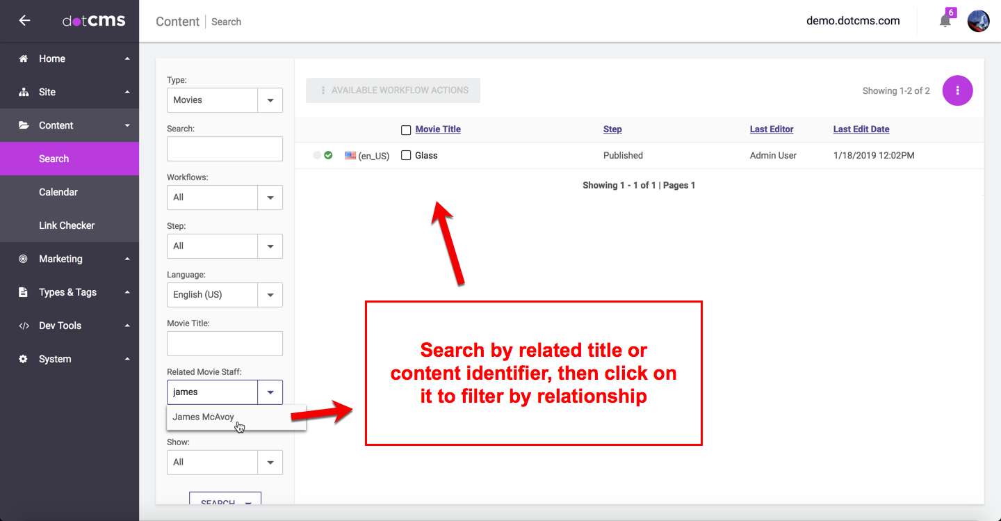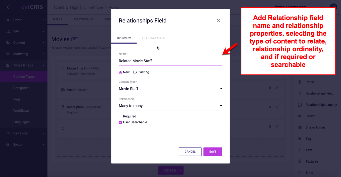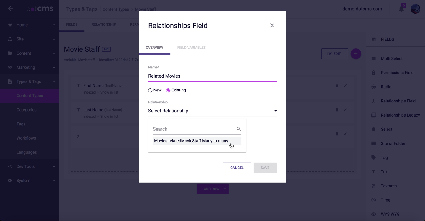 For example, when adding a content item of an "Movie" Content Type, you might want to add a relationship from the "Movie" contentlet to a "Movie Staff" type of content so that dynamic page listings can show pulls of Movies that show a listing of the cast, and conversely, actor/actress/director detail pages that show listings of all the movies they have worked on. Any type of content can be related to another using relationship fields. Content Types can also be related to the same content type. The dotCMS documentation site, for example, utilizes a single content type, and documentation content is related to other documentation content at several levels and are organized and pulled entirely by their relationship to each other.