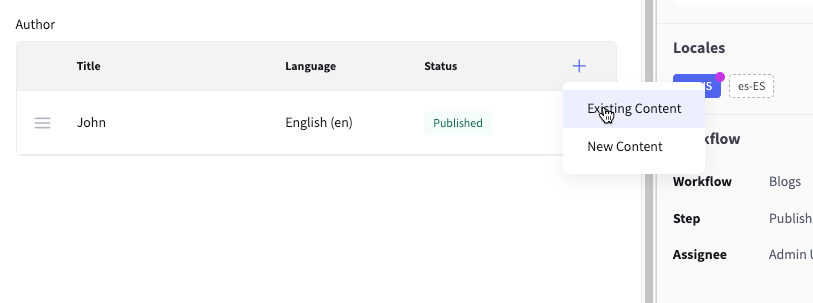 When used within the new content editor, Relationship fields allow the creation of new content through the + button. This content will be related from the moment of its creation.