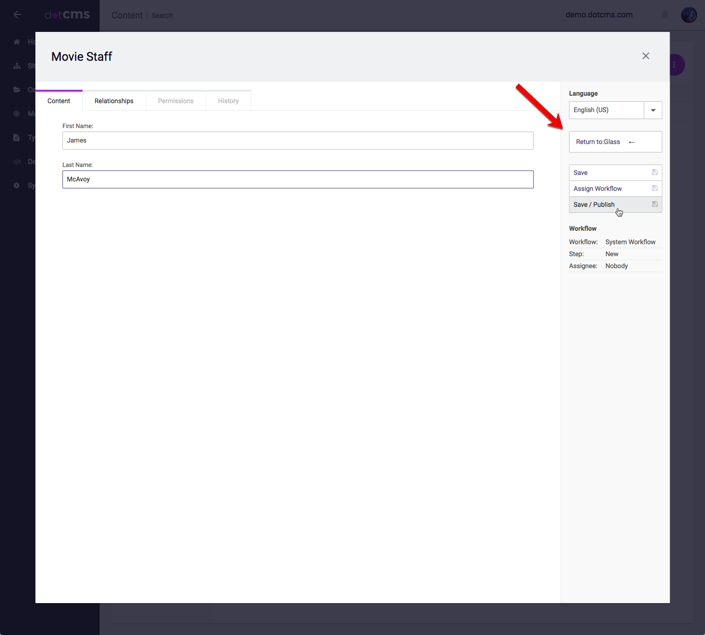 When relating content in this way, content contributors can return to the originally edited contentlet by clicking on the "Return to [content title]" option as shown below: