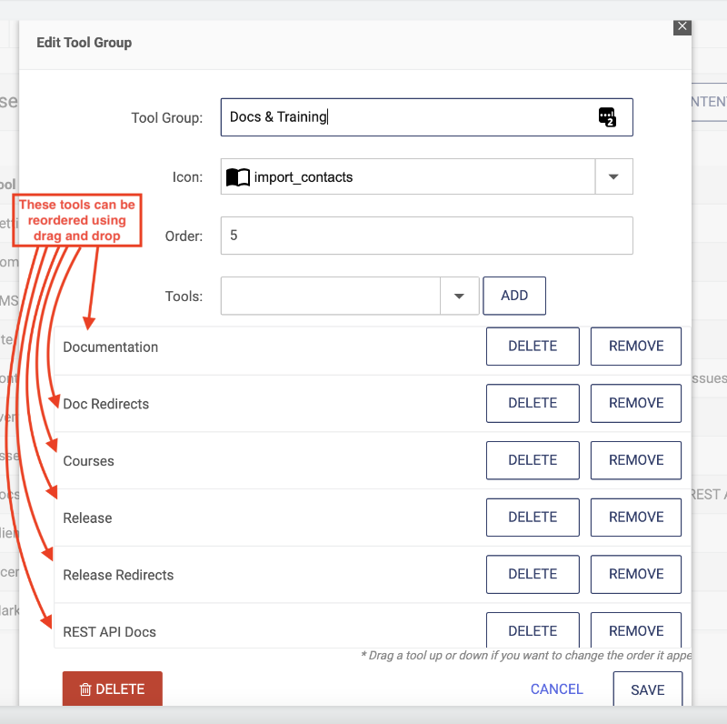 Each Tool Group is a collection of tools, all of which display under the name of the Tool Group in the back-end navigation side bar.