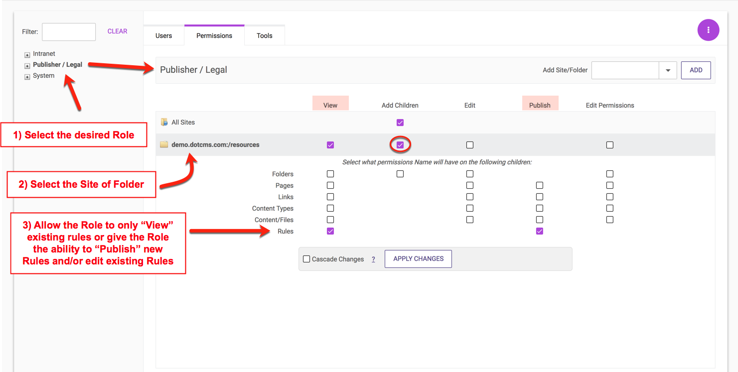 The example below shows the two minimum permission settings required for a user Role to add new Rules to a Site whether thru the dotCMS UI or using the REST API:
