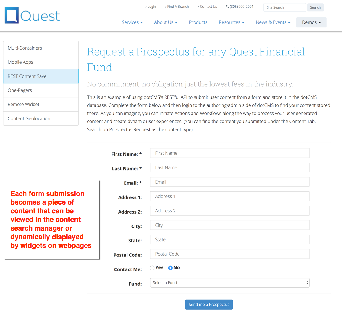 Following the steps in the Form Creation documentation creates a form similar to the following form sample (form fields are custom to each form). For complete instructions on creating a Form in dotCMS, please see the REST API Form Creation documentation. This form is a REST API Form and can be found on the demo site at ** https://demo.dotcms.com/admin ** (U: admin@dotcms.com | P: admin). The path to the form is: ** https://demo.dotcms.com/demos/rest-content-save **