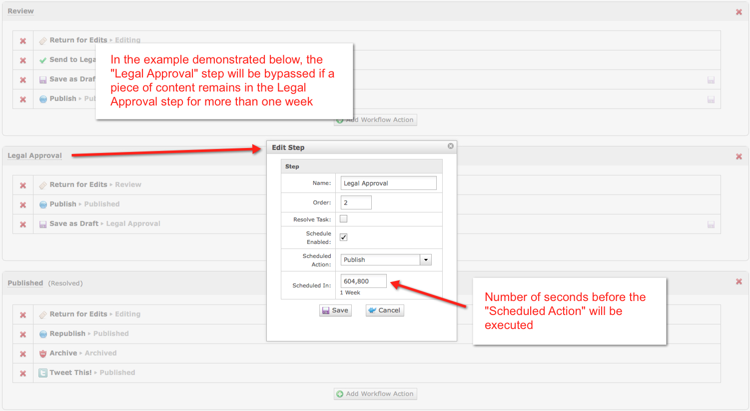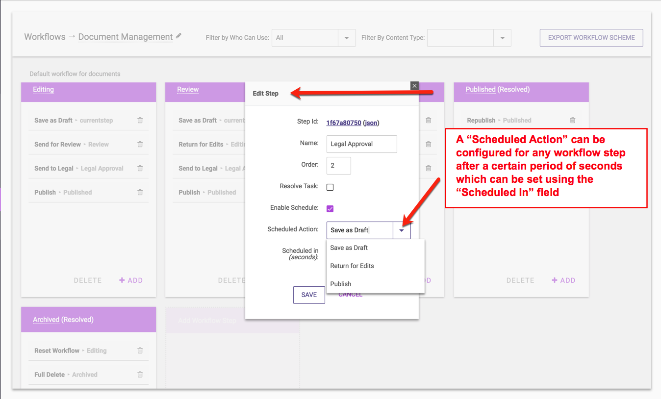 • So the scheduled Action will still be executed even if other Actions have been taken on the content since it moved into this Workflow Step.