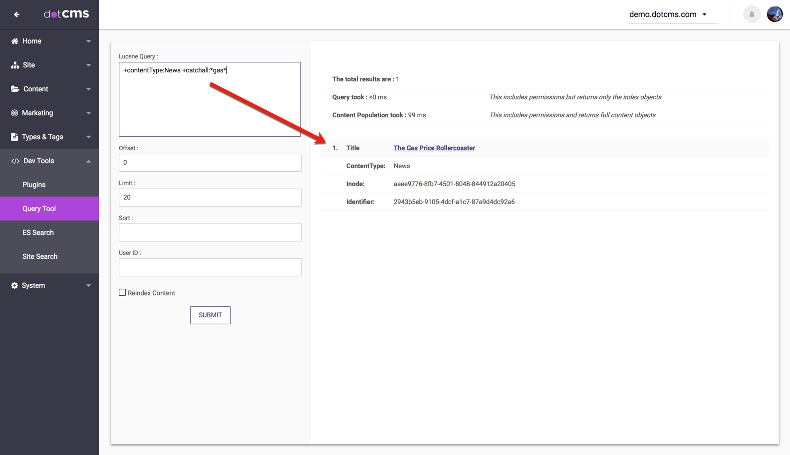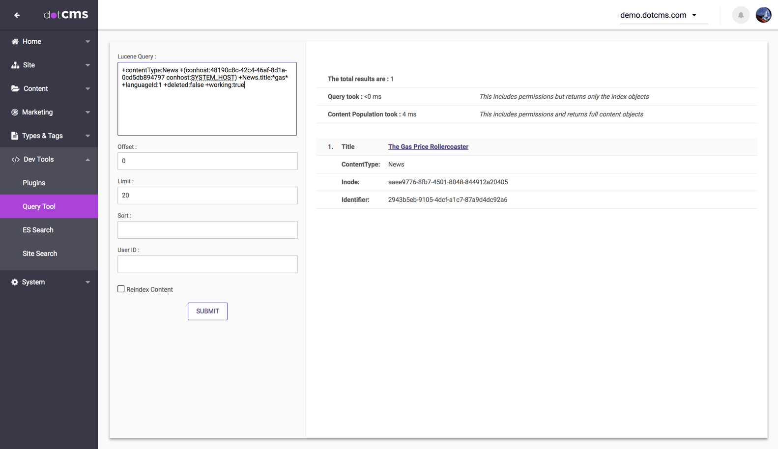 The dotCMS starter site (and the dotCMS demo site) contain a News Content Type which has the following searchable or indexed fields: