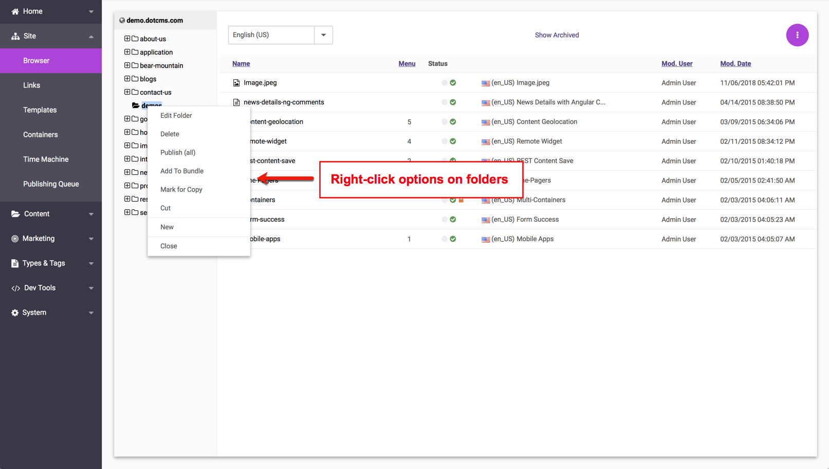 - Push Publish- adds the folder or object to the push publishing queue (requires an Enterprise license and Push Publishing configuration)