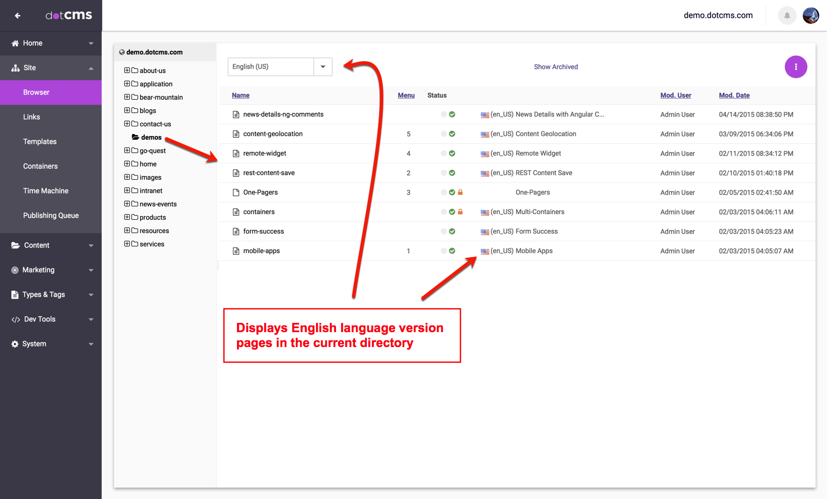 The Show Archived button can be toggled on and off to view archived File Assets and Pages. If a File Asset, Page or folder is accidentally archived, clicking Show Archived will reveal them so they can be unarchived. It is recommended that you routinely remove older archived objects from a dotCMS. For more information on these cleanup tasks and how to automate them, please see the Backend Maintenance Tasks documentation.