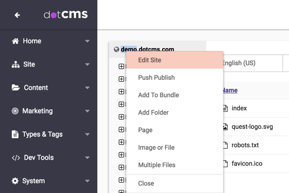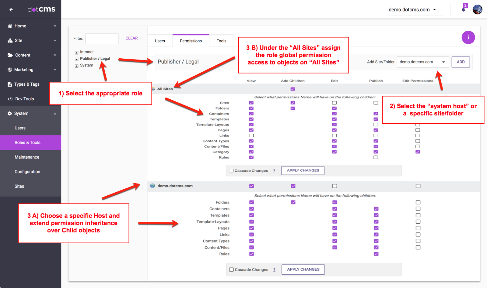 Any permissions that can be set on an object from the System Browser tab can be set from the System → Roles & Tabs screen. Defining Site permissions at this level sets up a Role inheritance hierarchy for the Site and all its dotCMS object "children." To set up Role permission inheritance* on a Site, perform the following steps: