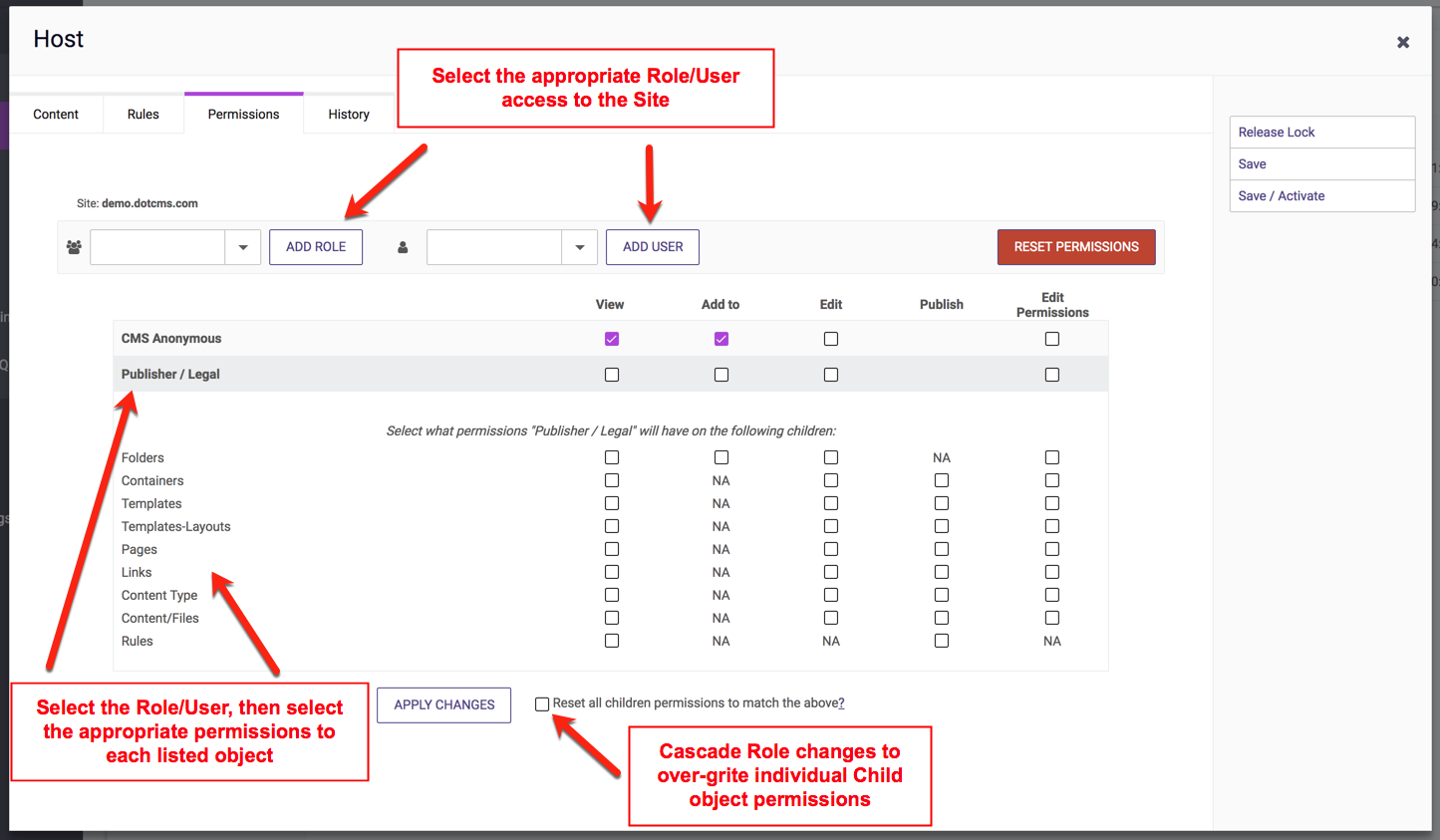 - To cascade or apply the Site permissions to all folders and objects that currently exist as "children" beneath the Site, click the "Reset Children Permissions" checkbox and click the "Apply Changes" button to OVERWRITE all "child" permissions to match the Site level permissions. Give careful consideration to the permission requirements of child objects before overwriting child object permissions.