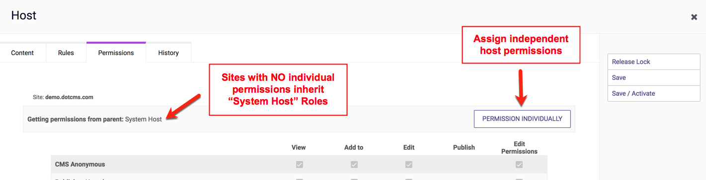 - Although Role inheritance from the System Host is probably more efficient in most cases, permissions on the Site can be individually set by clicking on the "Permission Individually" button on the Site object.