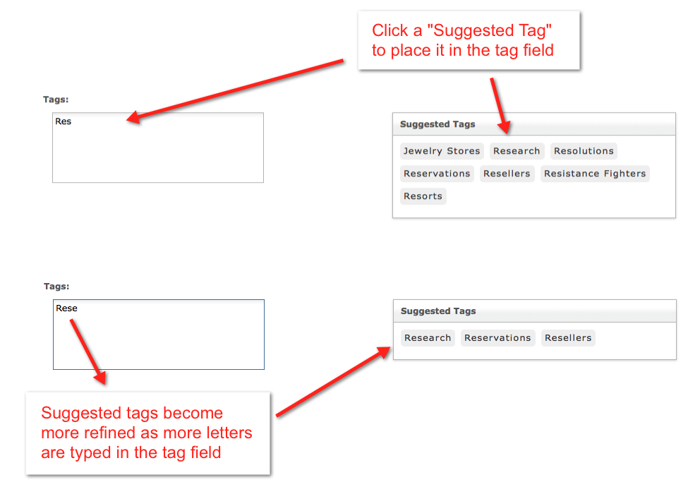 As content is entered, a pool of auto-displayed suggested Tags help keep Tags consistent and ensure different content contributors use the same naming conventions. Users may select tags from the suggested list (using the mouse or keyboard), or may continue typing to create a new tag which has not yet been used.