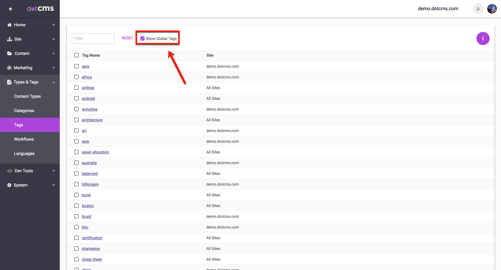 In addition to the Tag Repositories on each individual host, there is also a Global Tag Repository available to All Hosts on a dotCMS instance. This is the default location for all new Tags entered by users into Tag fields in Content.