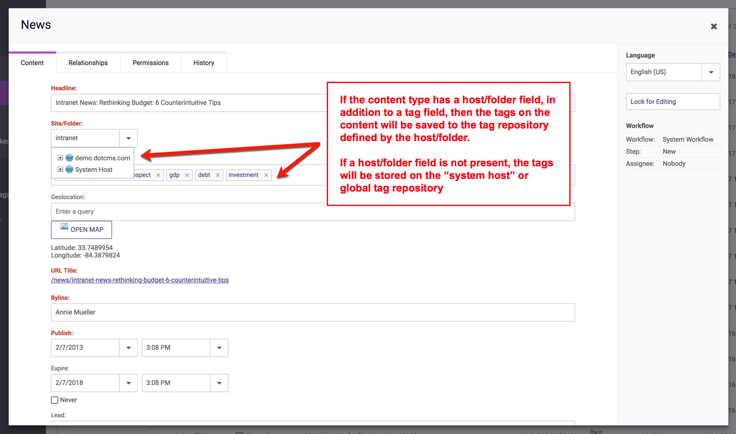 - When the Content Type Host or Folder field) is set to a second Host, the both the Content and Tags for that content are stored on the second Host.