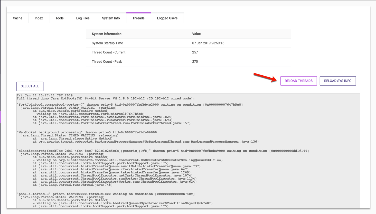 To display detailed information on all individual threads, press the Reload Threads button. A list of each thread with its full stack trace is provided.