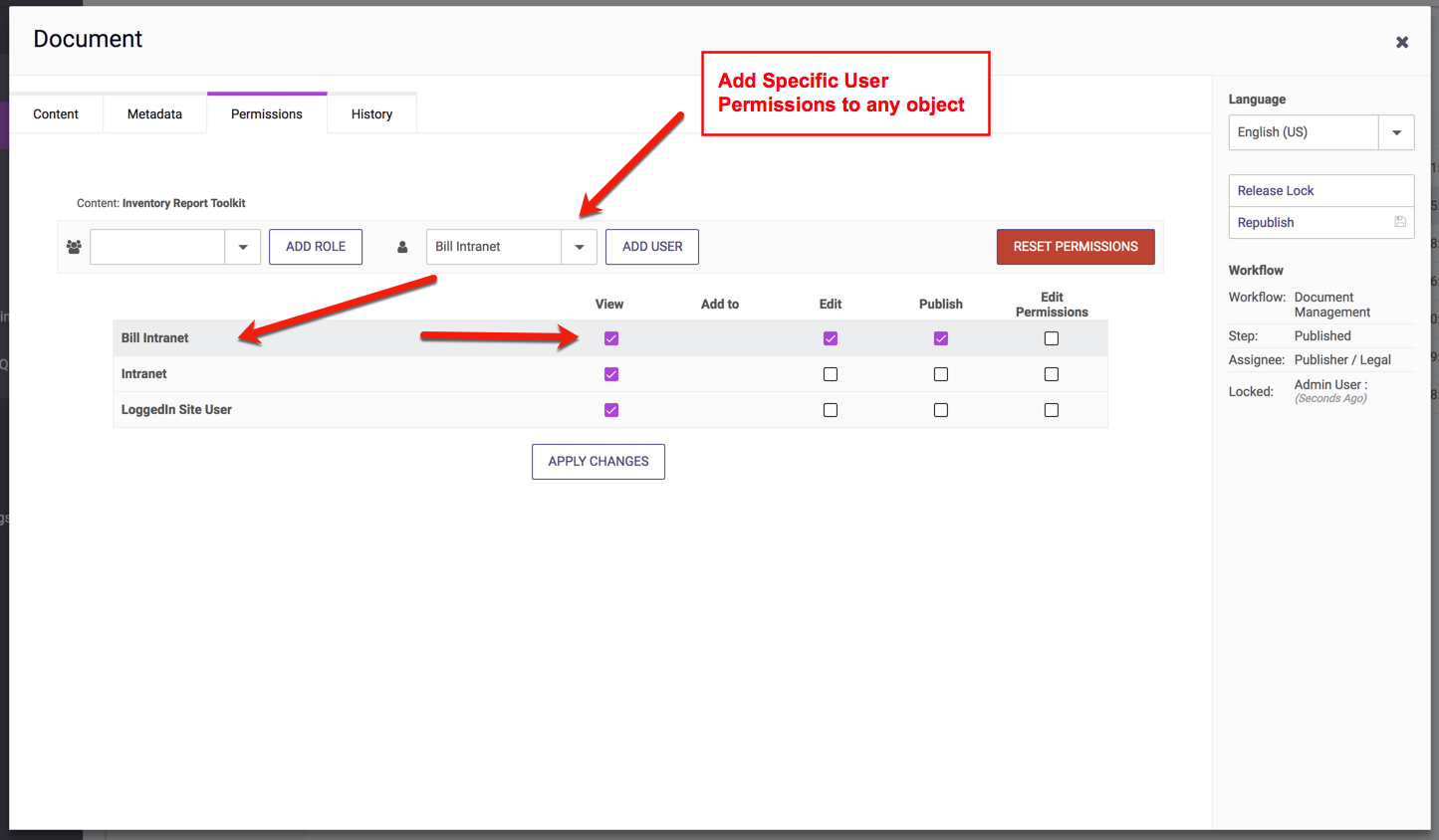You may also change individual User permissions when editing specific objects. The Permissions tab in each object allows you to select Roles or Users.