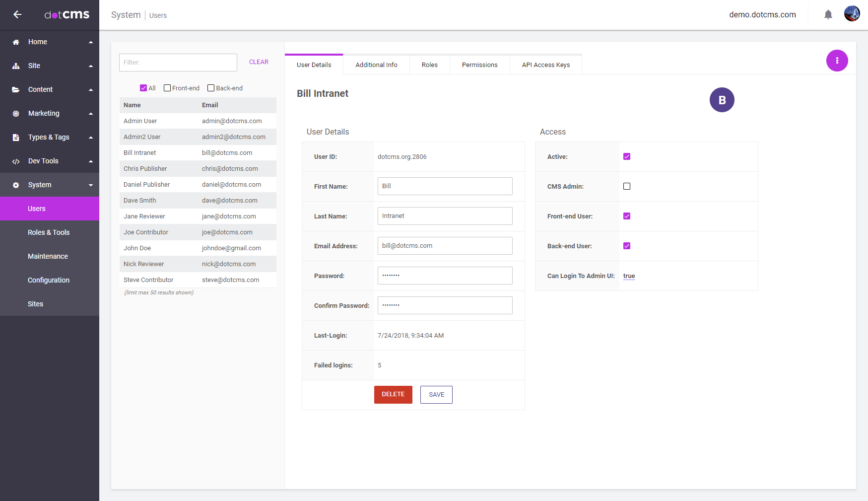 Every User in dotCMS can be configured as a Front-end user and/or Back-end user. Front-end users may submit content via forms on the front-end of your site. Back-end users may login to the dotCMS back-end.