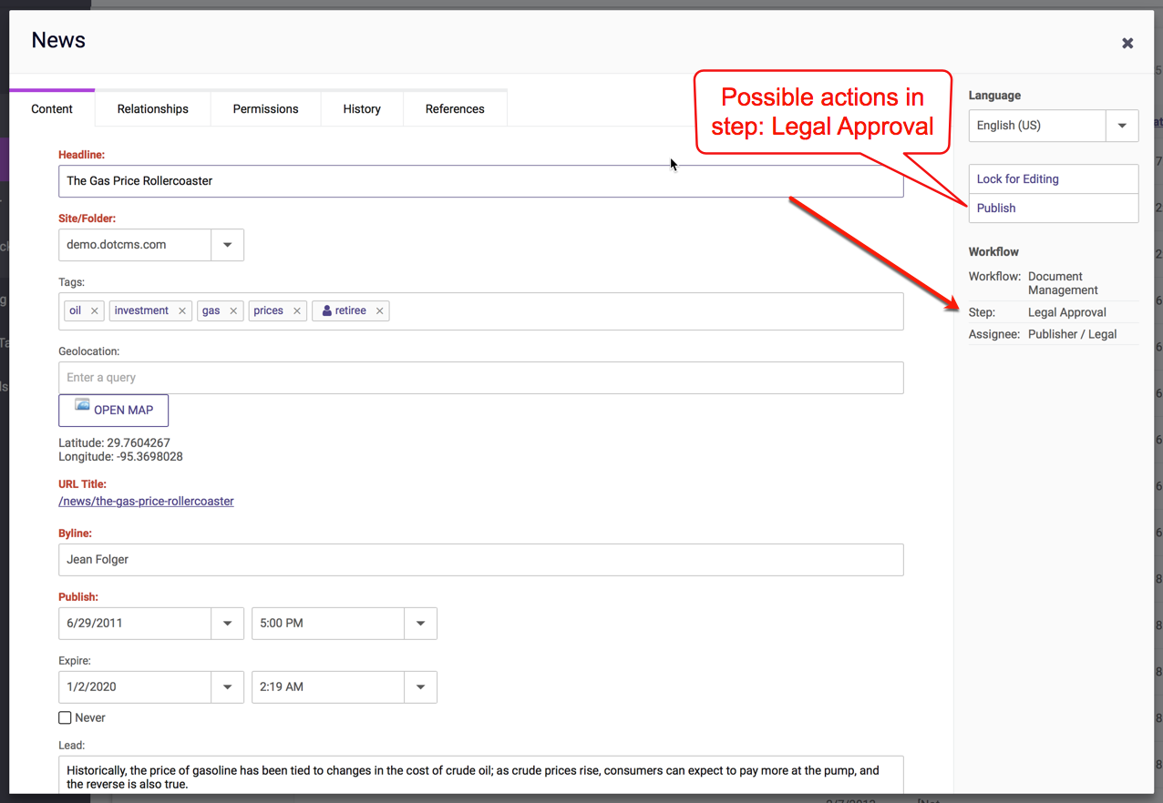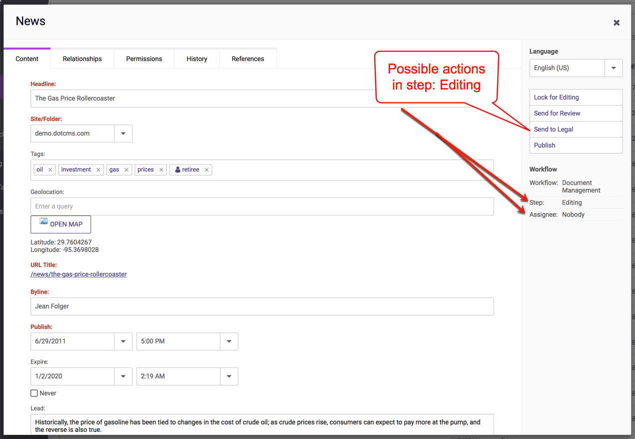 • The only actions available on a content item are those associated with the Workflow Step the content is currently in.