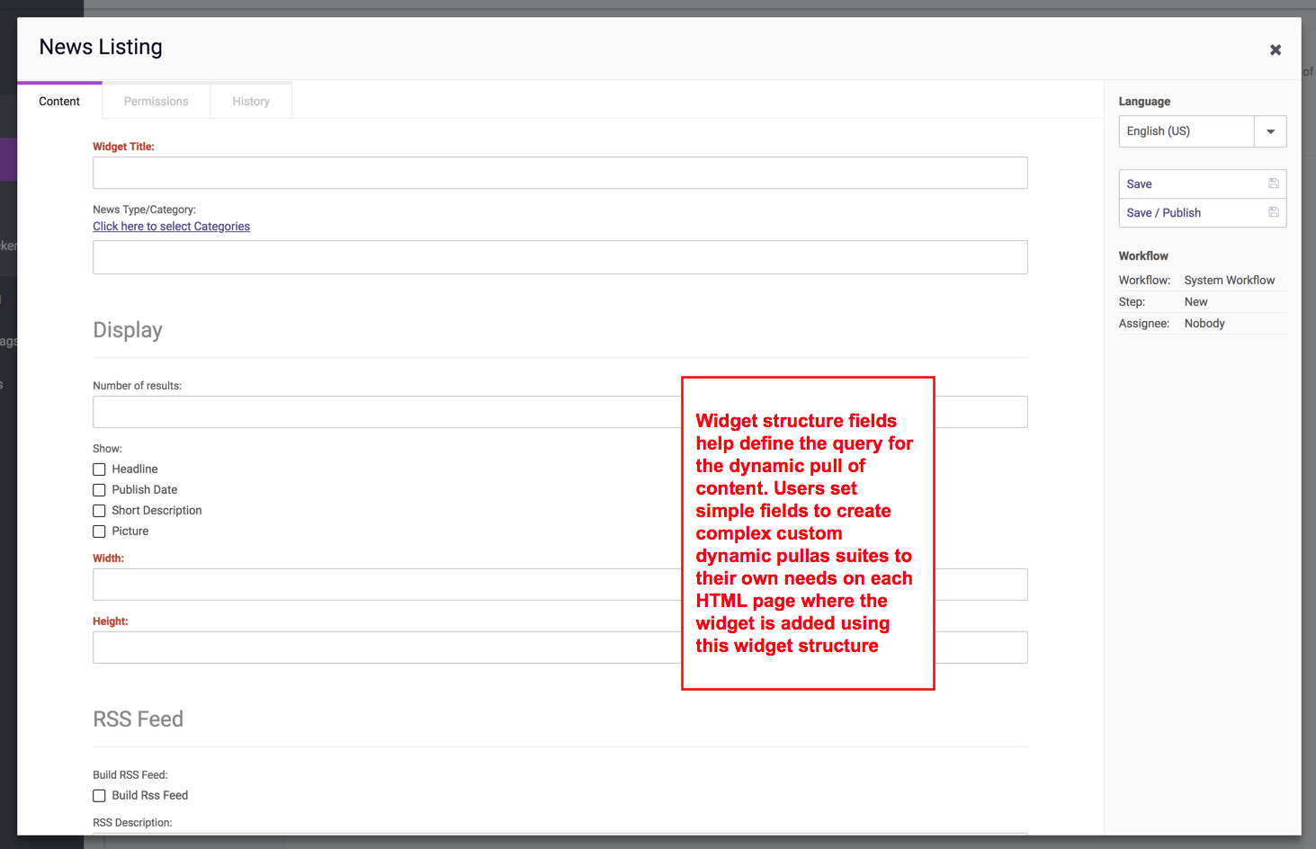 *In the example image provided, the field values provided by backend users (with permissions to the Widget Content Type), determine how many and what type of News Items should be pulled dynamically by the News Listing widget.