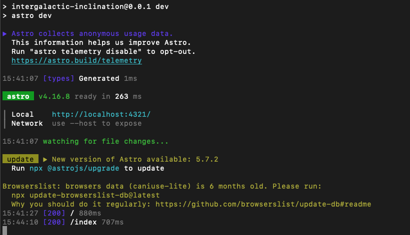 Run the dotCMS Astro example locally to see it in our browser. Navigate to the root directory of your Astro application (e.g. intergalactic-inclination) and execute the following: