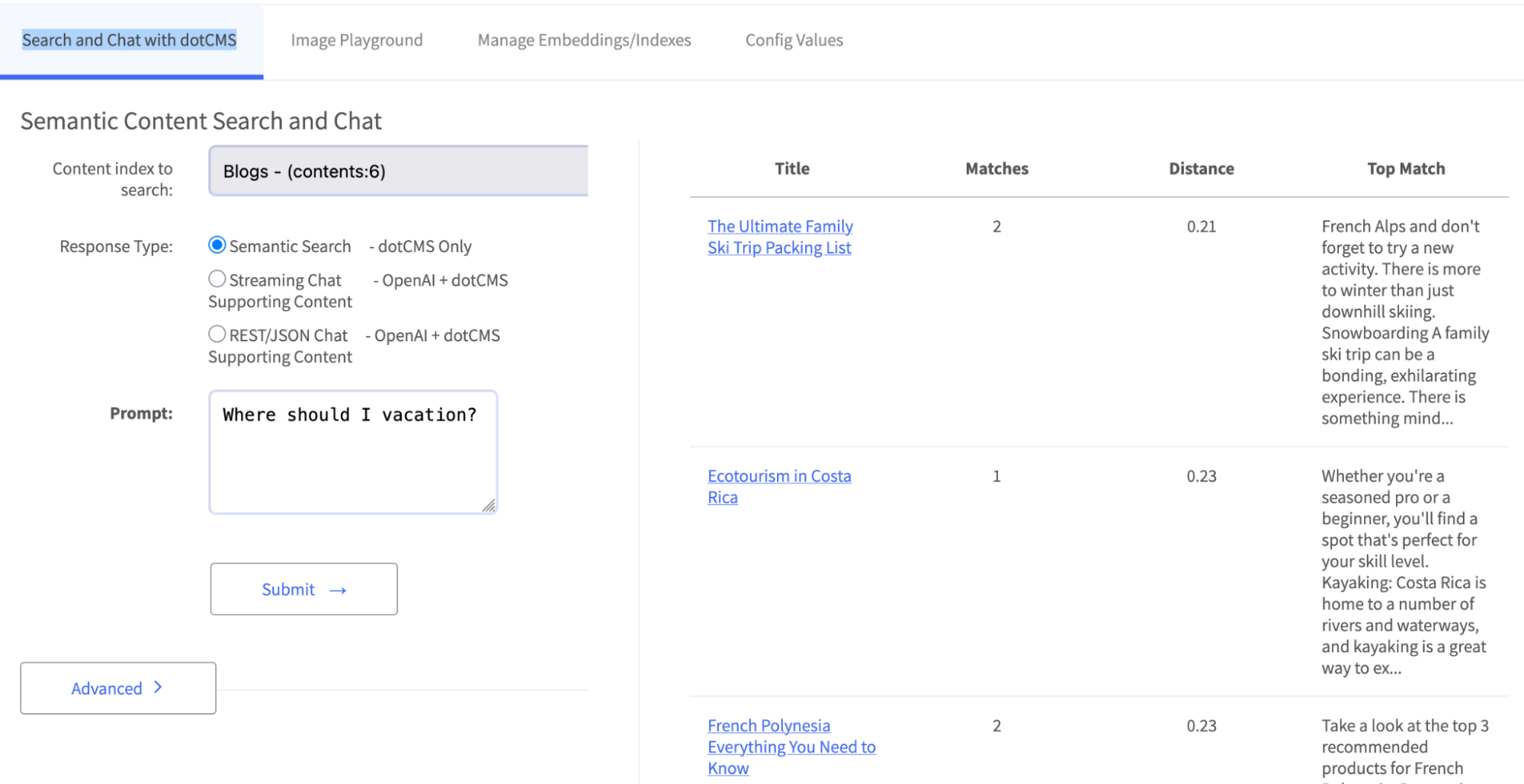 Once the index finishes building, you can go to Search and Chat with dotCMS, select the new index and start playing around!